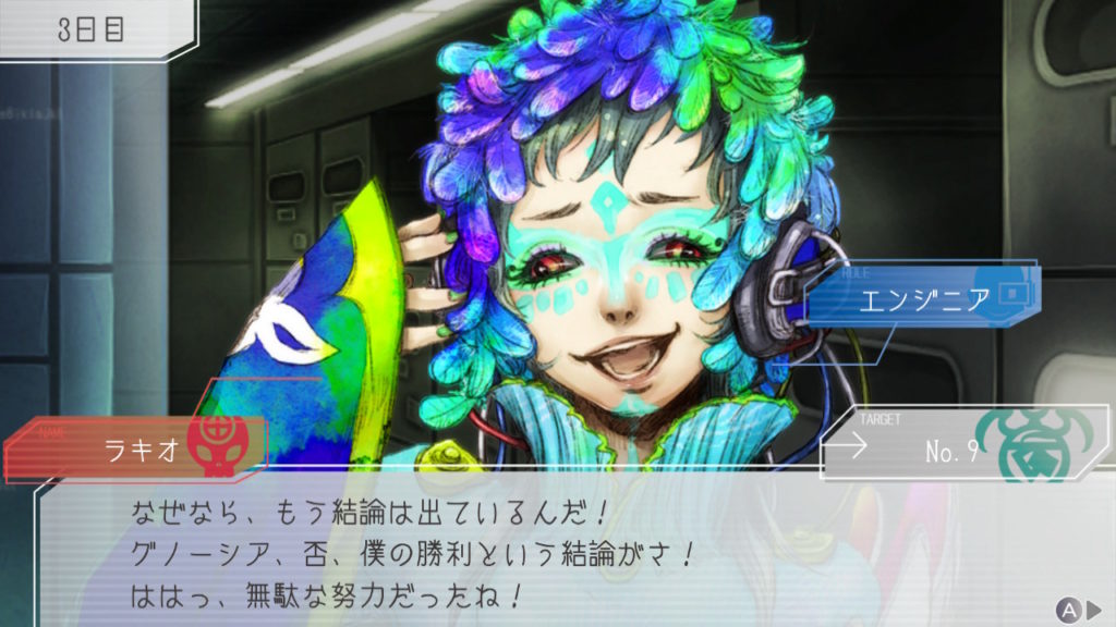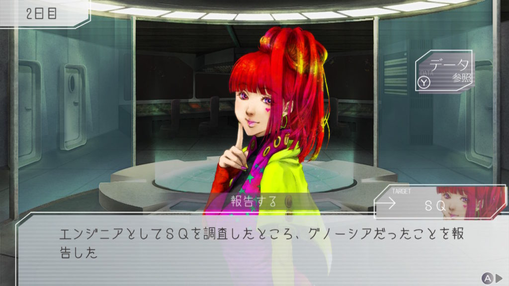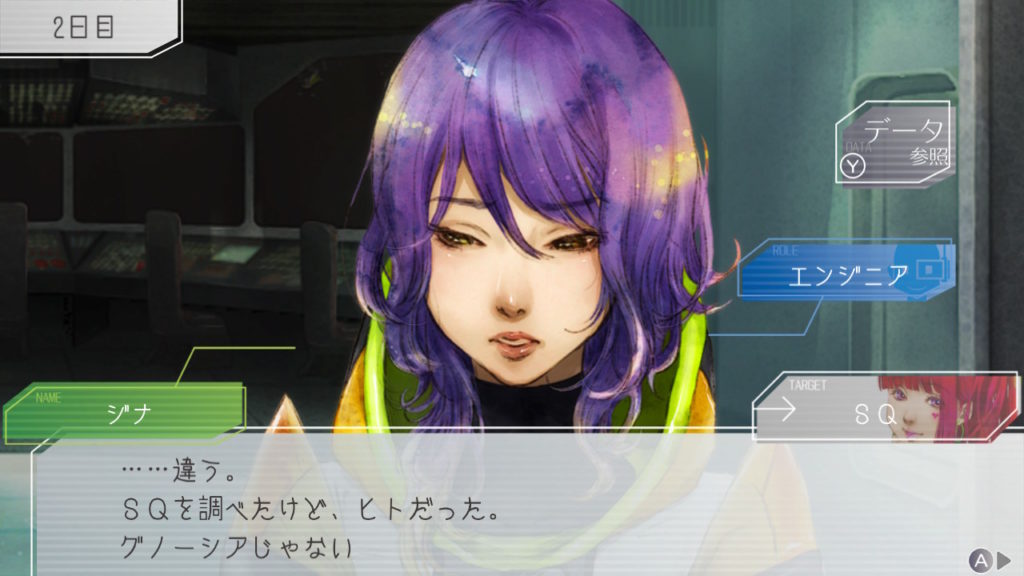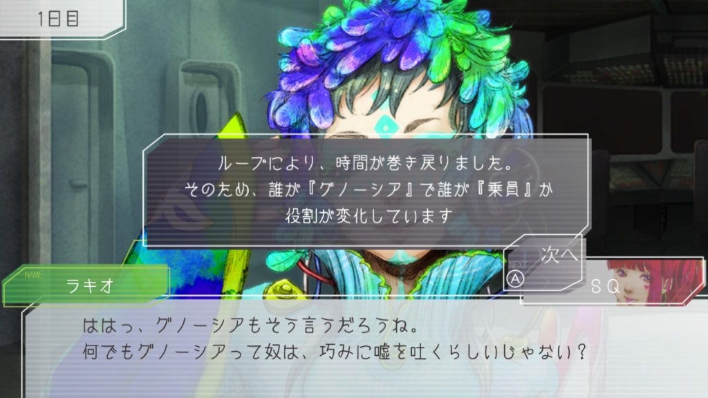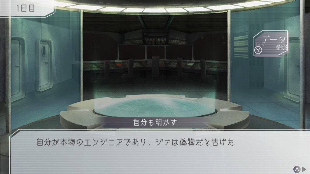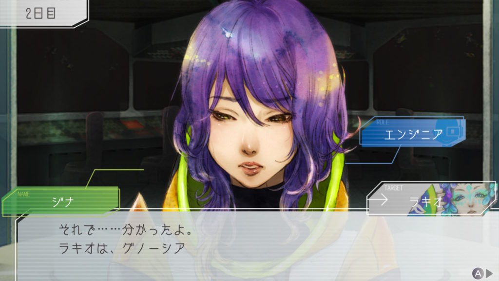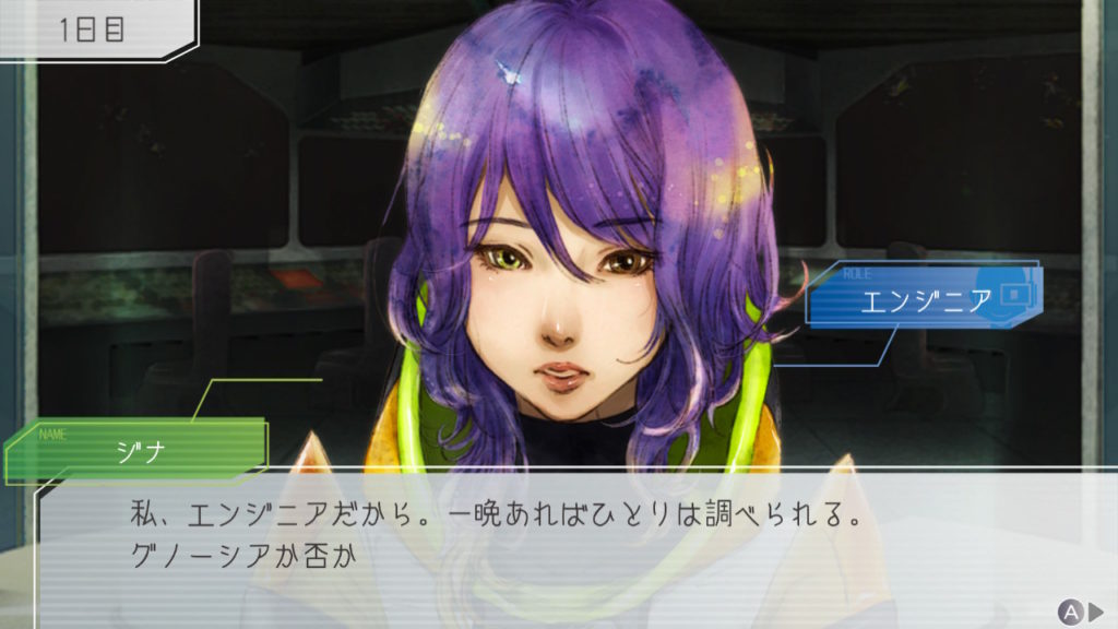 昨晩はセツが消失し、主人公・ジナ・ラキオの3人で話し合い。ジナちゃんがエンジニア(空間転移の度に誰がグノーシアか調べることができる役職)をカミングアウトしてラキオがグノーシアであると報告していた。乗員データが汚染されている可能性があり、エンジニア権限との紐づけが困難な状況らしく、ジナちゃんがエンジニアであるという証明はできないとのこと。