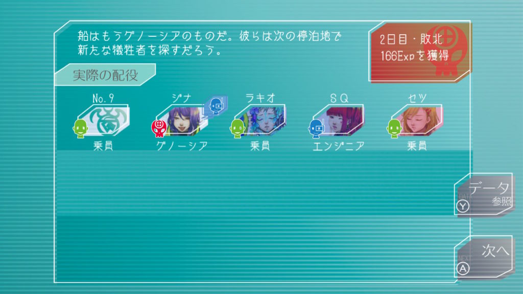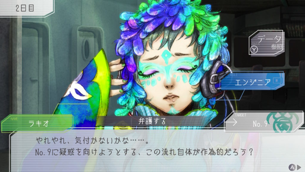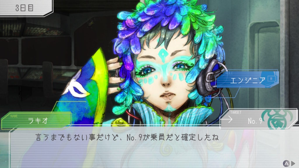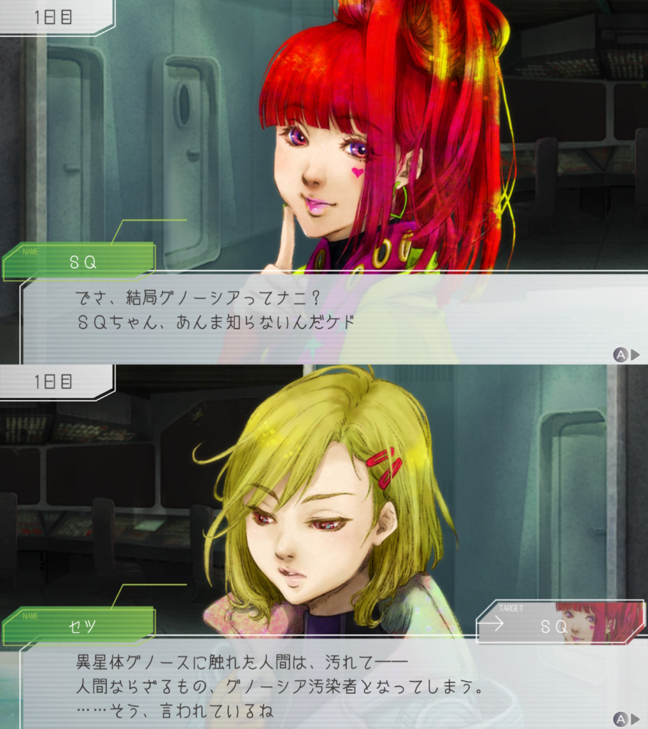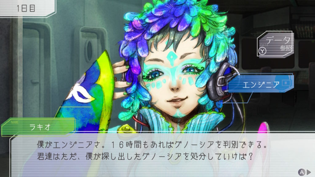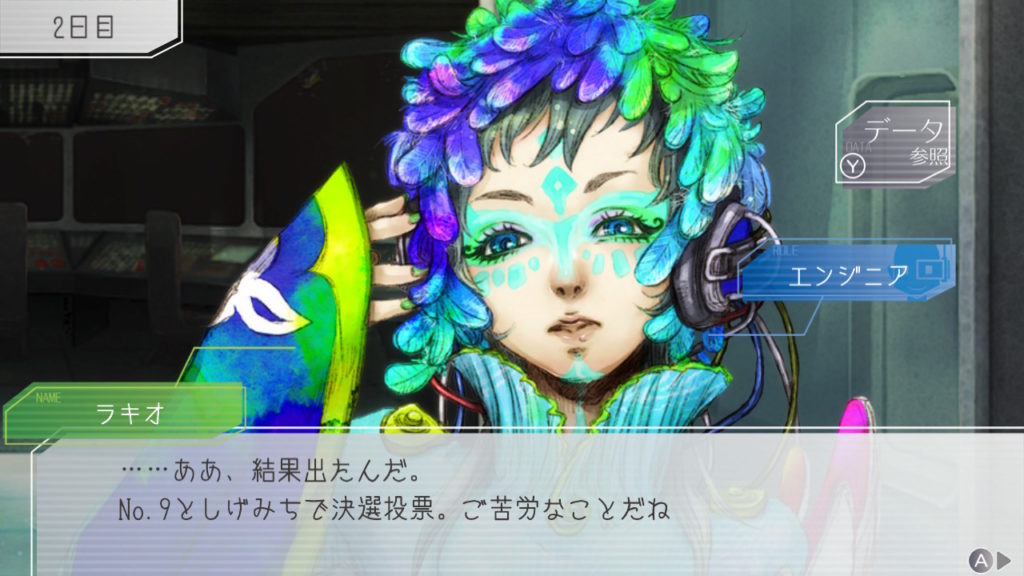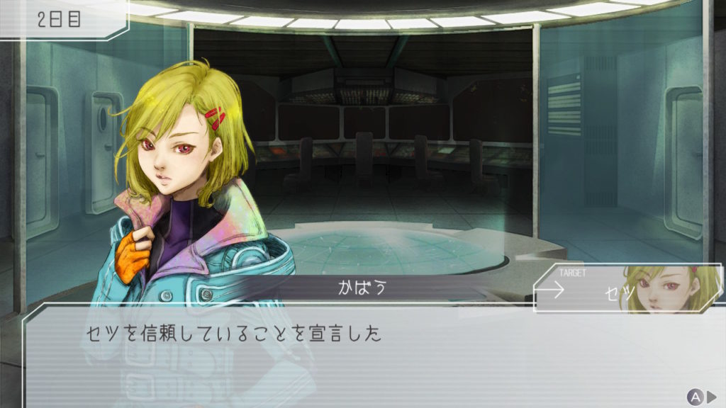 昨晩はセツが消失し、主人公・ジナ・ラキオの3人で話し合い。ジナちゃんがエンジニア(空間転移の度に誰がグノーシアか調べることができる役職)をカミングアウトしてラキオがグノーシアであると報告していた。乗員データが汚染されている可能性があり、エンジニア権限との紐づけが困難な状況らしく、ジナちゃんがエンジニアであるという証明はできないとのこと。