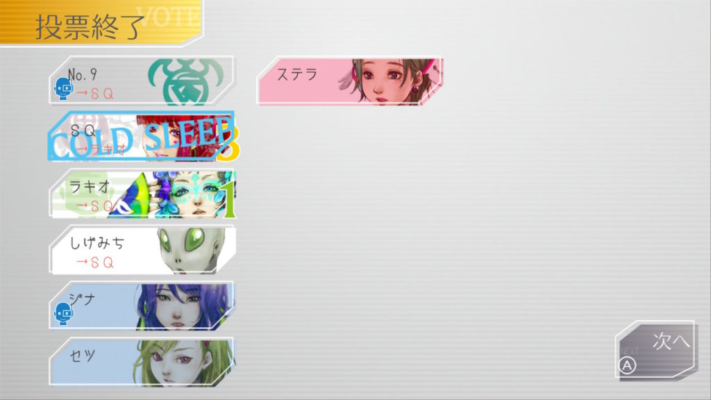 この日はSQちゃんとステラさんがお互いをかばい合ってて怪しいと思ったんだけど発言力が全くなくて票がバラバラになってしまい⋯⋯