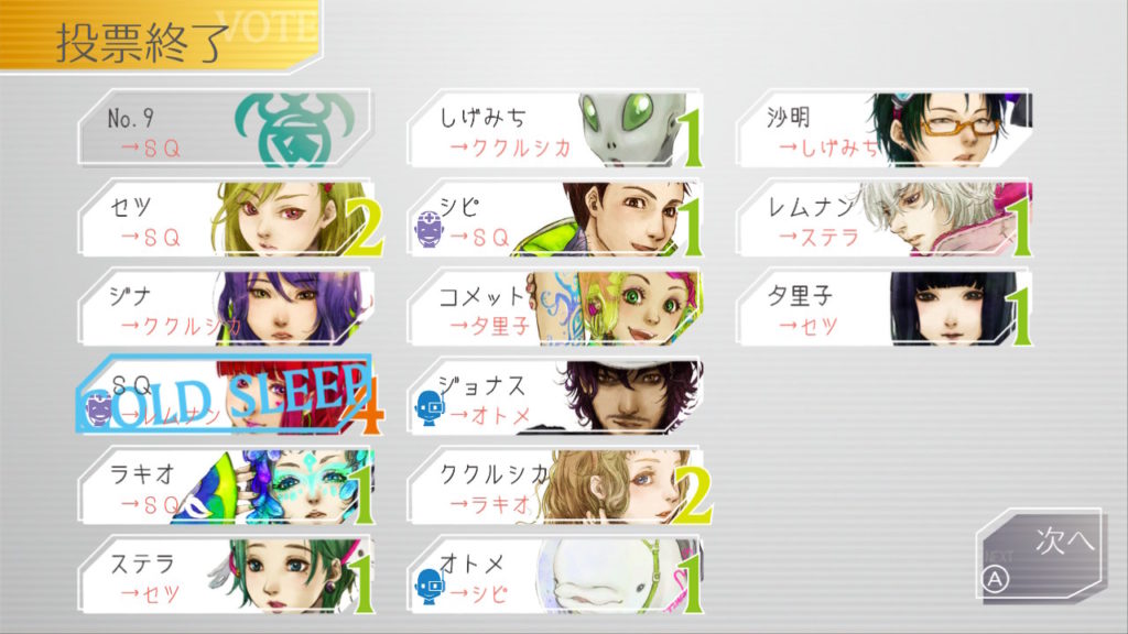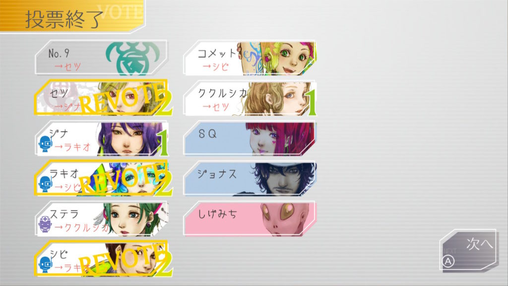 議論中のスクショがなかったので投票時のみで失礼。私はジナちゃんがグノーシア判定を出したSQちゃんに票を入れてます